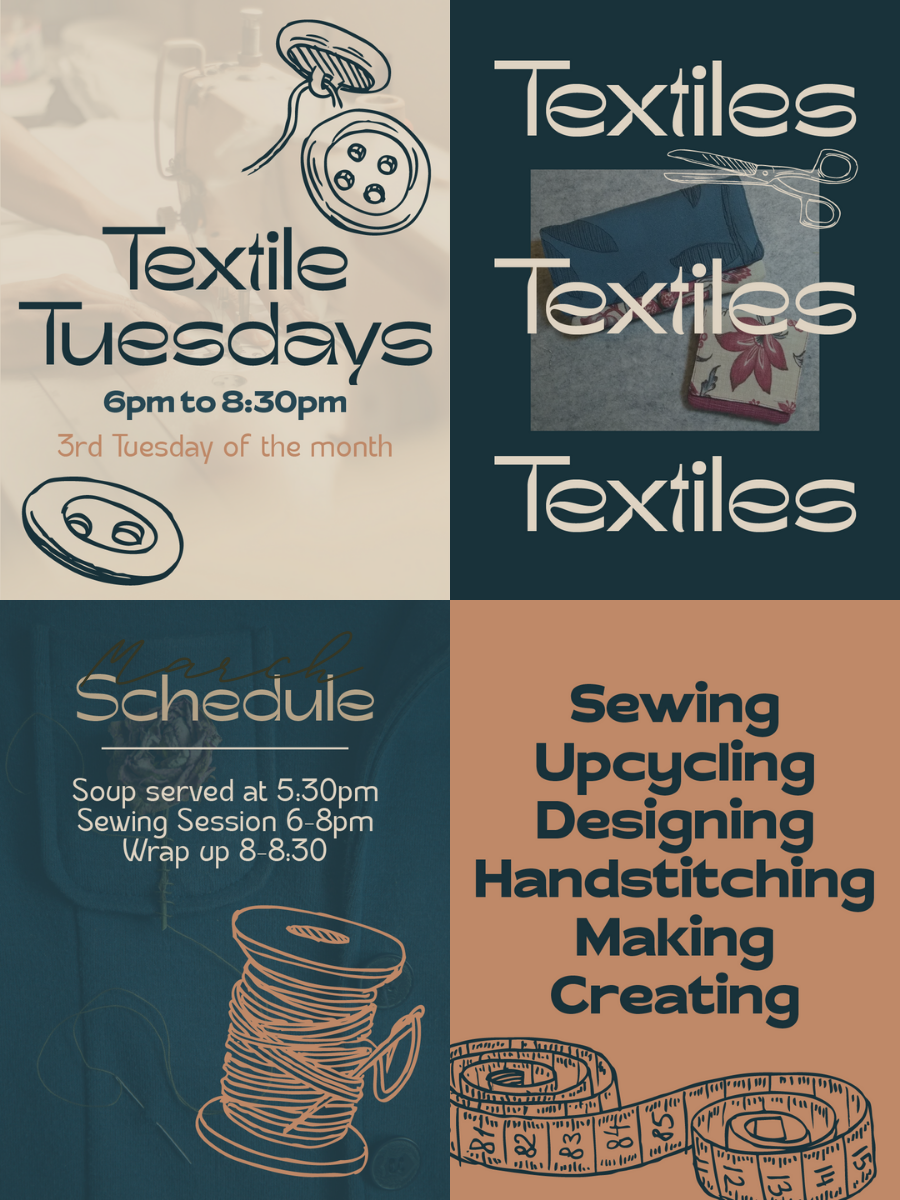 Ready to take your sewing to the next level? Join Textile Tuesdays, a monthly hands-on creative club led by Michelle Matthews (Remnant Revival) and Lory MacDonald (The Artist’s House). You’ll learn sewing techniques from beginner to advanced, experiment with upcycling and pattern-making, and build confidence through guided projects.